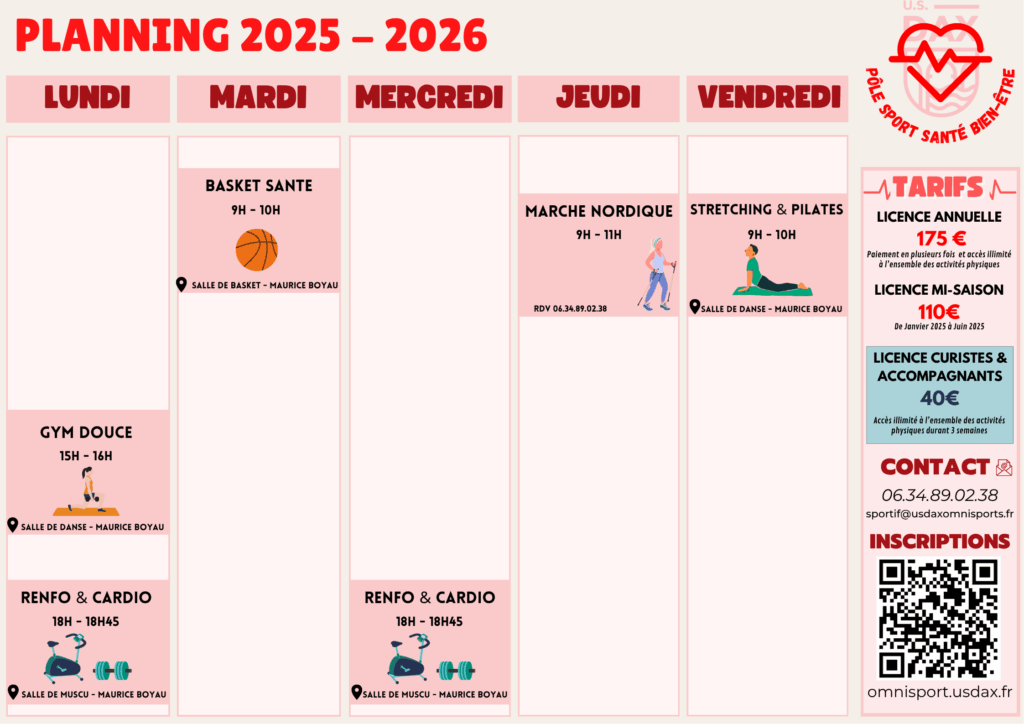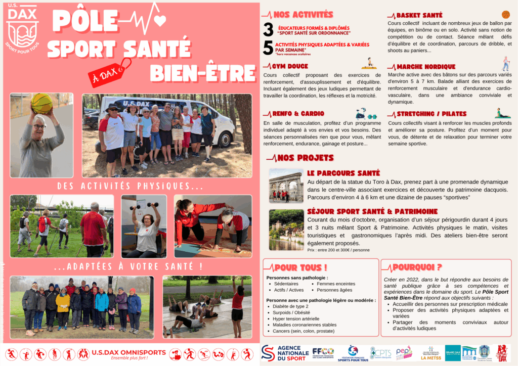 L’U.S.Dax Omnisports vous présente son Pôle Sport Santé Bien-Être ! Nos éducateurs diplômés en lien avec des médecins vous permettront de pratiquer une activité physique régulière adaptée à vos besoins : – Bien-être et loisirs – Réadaptation à l’effort – Remise en forme – Découverte de nouvelles pratiques Ces activités réparties sur la semaine sont également ouvertes aux personnes atteintes de pathologies légères ou modérées. Dans tous les cas, un accompagnement personnalisé sera mis en place avec des entretiens individuels fixant les objectifs et le programme adéquat.